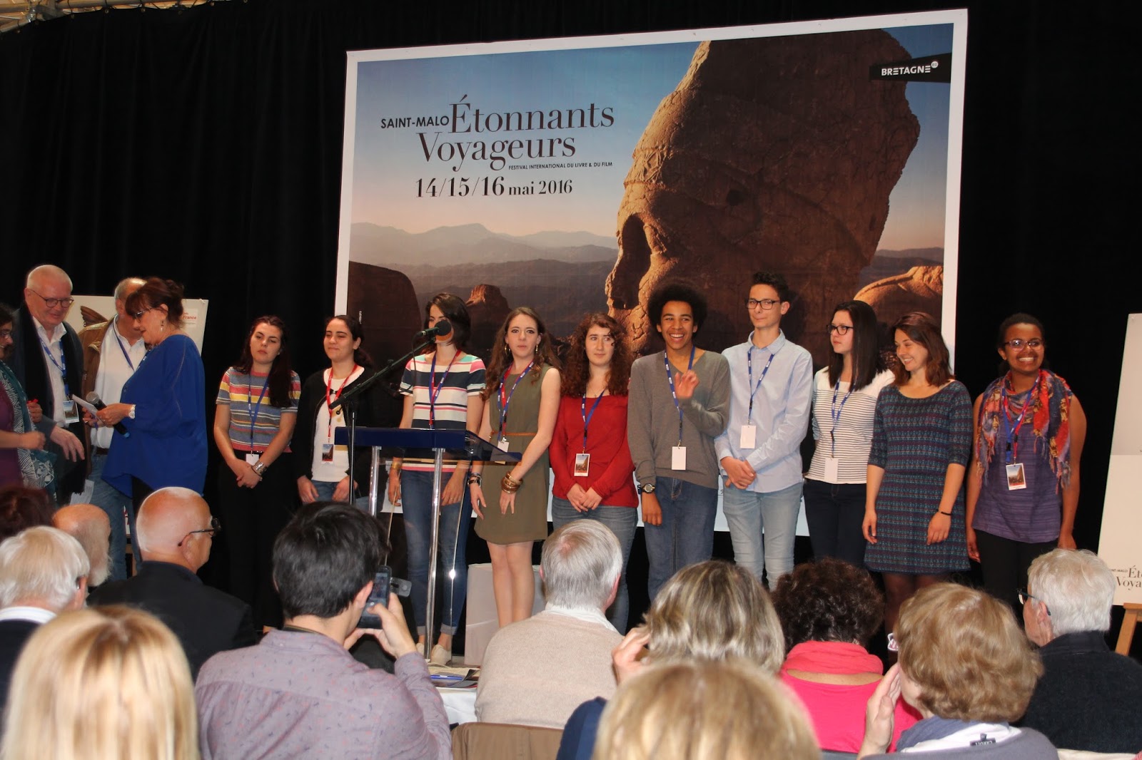 Il est déjà pratiquement 12h30, à savoir l’heure de remettre officiellement le prix, au Café Littéraire du Festival. Avec Juliette, nous avons la grande chance d’être choisies pour annoncer aux 400 (Je crois que c’est le nombre que Juliette, habituée du salon, m’a donné) personnes présentes devant nous le nom du grand gagnant. En coulisses, nous répétons à voix basse notre phrase, avant de monter sur la scène.