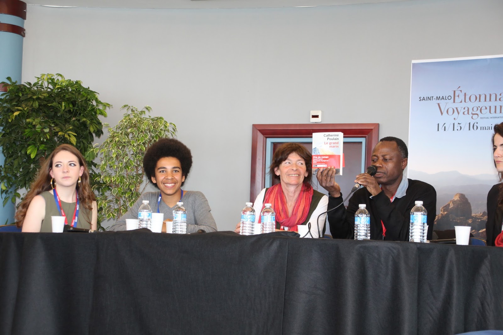 16h45, l’heure de la conférence. Là encore, Juliette et moi avons la chance d’être choisies pour animer la conférence avec Catherine Poulain, accompagnées de Félix et Claire, ainsi que de l’écrivain Sami Tchak. Pendant une heure, nous interrogeons l’auteure, en écho avec le public attentif. J’ai le sentiment que Catherine a tellement de belles choses à nous raconter, je pourrais l’écouter des heures. Elle dégage un charisme aussi naturel que fascinant, c’est simplement beau. Je suis honorée d’avoir pu la découvrir ainsi.